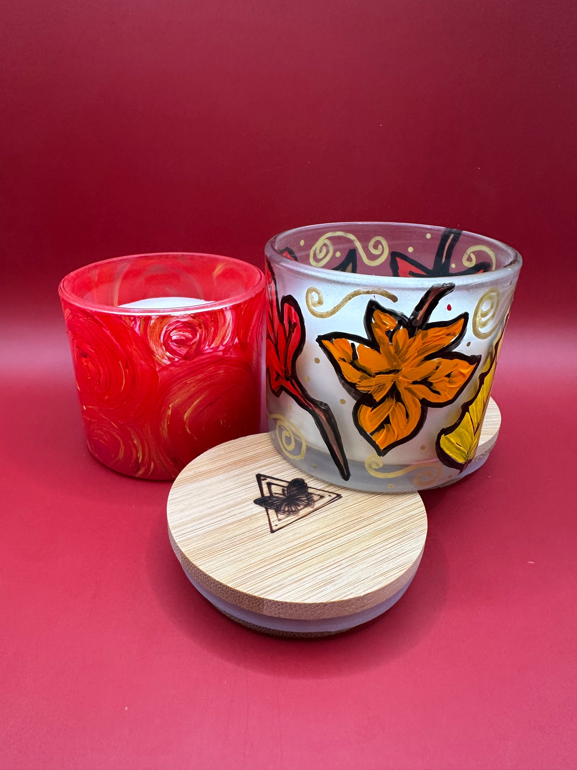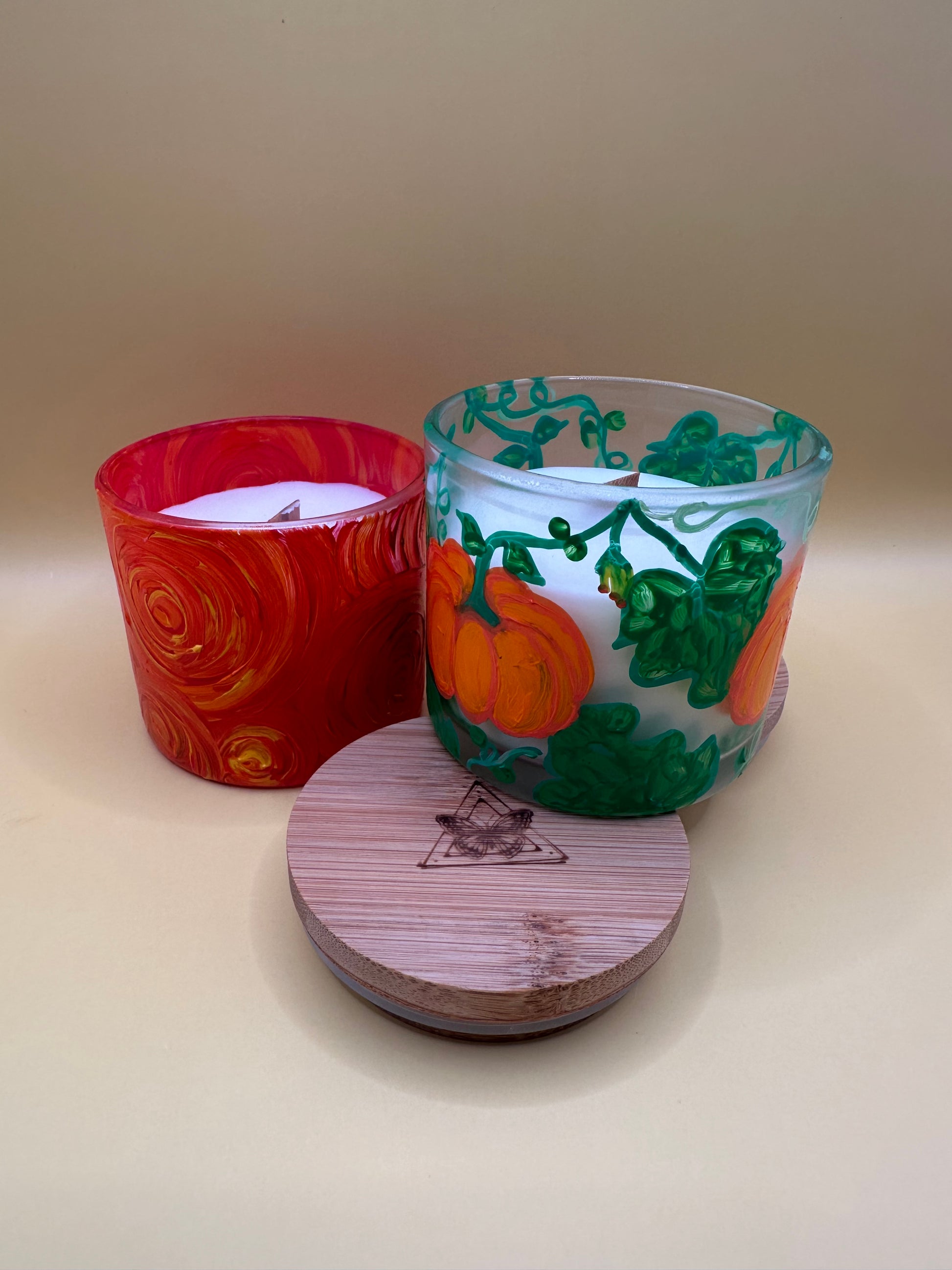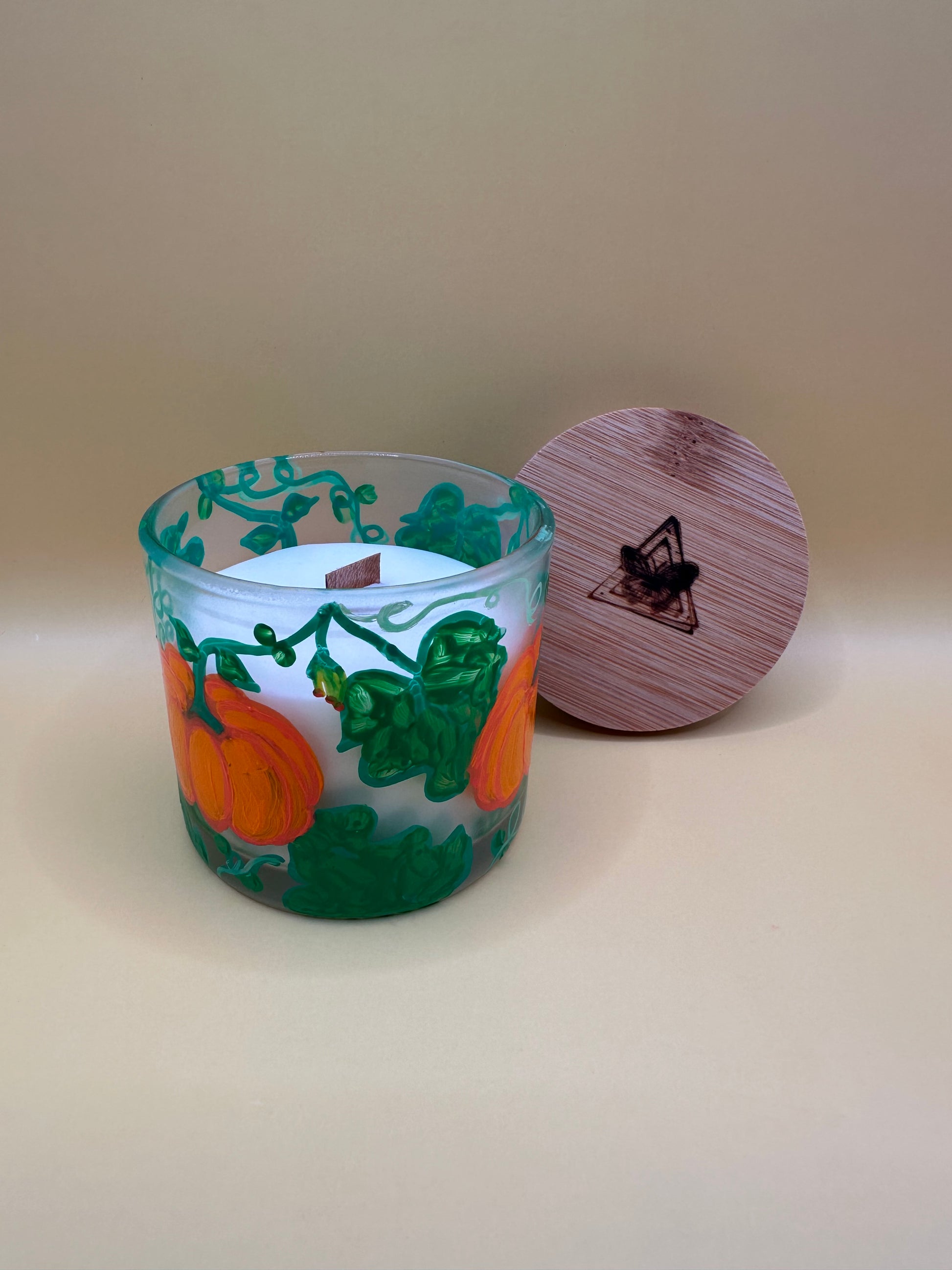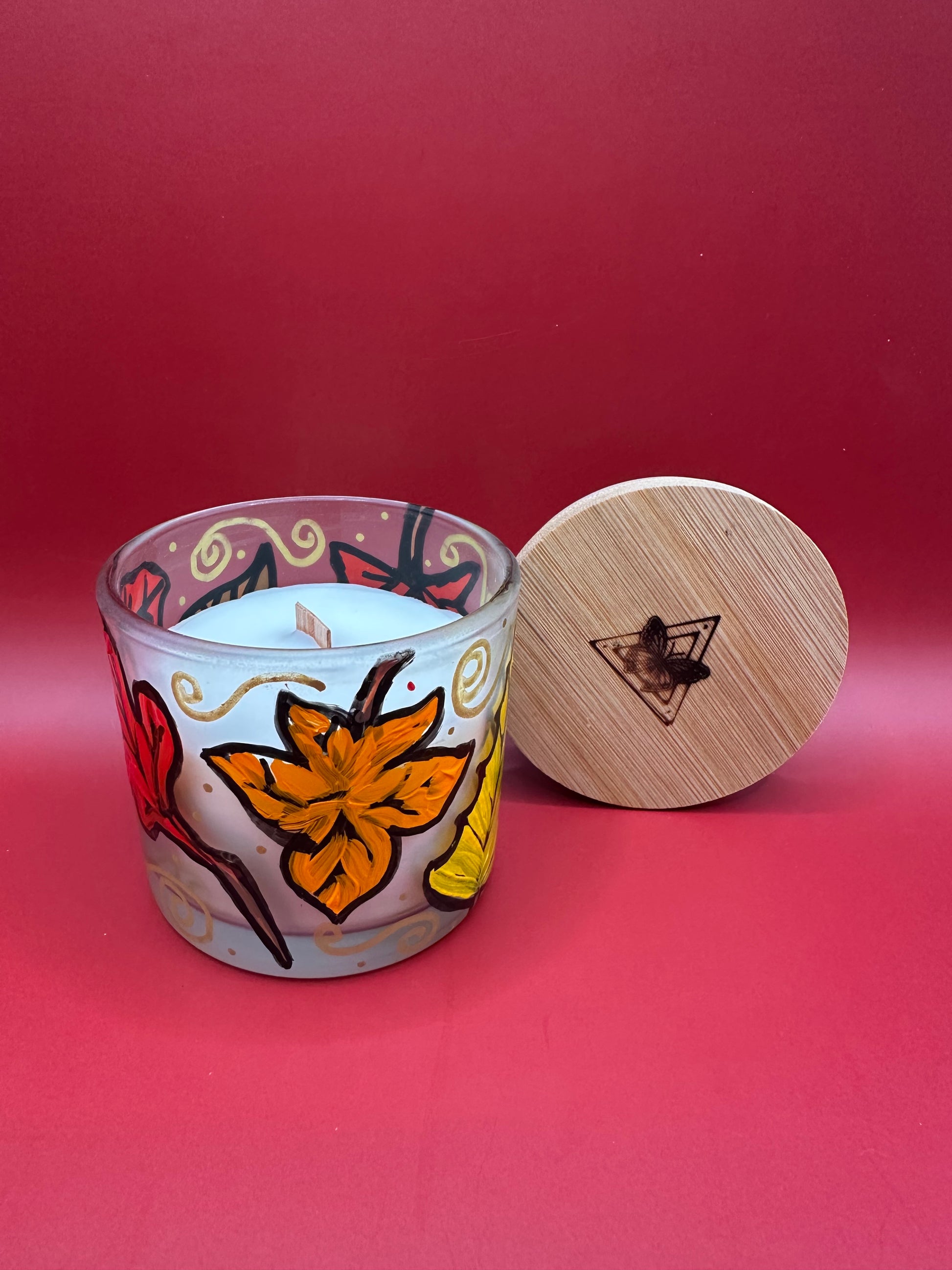 Elevate your ambiance and add a touch of luxury to any space with our hand painted candles. With unique images and scents for each season, there's a perfect choice for every occasion. Made with premium ingredients like virgin coconut soy wax and non-toxic scents, our candles feature wooden wicks for a clean and even burn. And with a reusable frosted vessel and bamboo lid, you can enjoy the benefits of our candles while keeping impurities out.