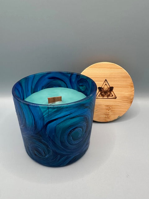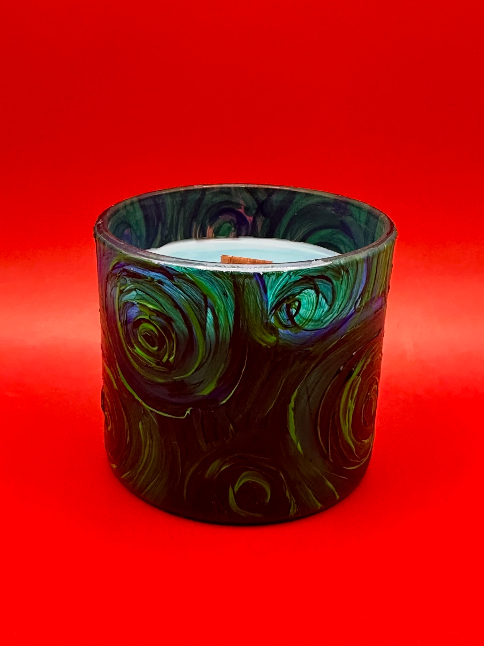 Drawing from a passion for impressionistic art, these hand painted candles beautifully enhance the colors and fragrances of each season. With a mesmerizing celestial design, these candles illuminate like stained glass when lit. Crafted with natural coconut soy wax, environmentally-friendly dyes, and non-toxic scents, these candles bring pure delight to any living space. Featuring a wooden wick for a prolonged, clean burn and a bamboo lid to keep out impurities.